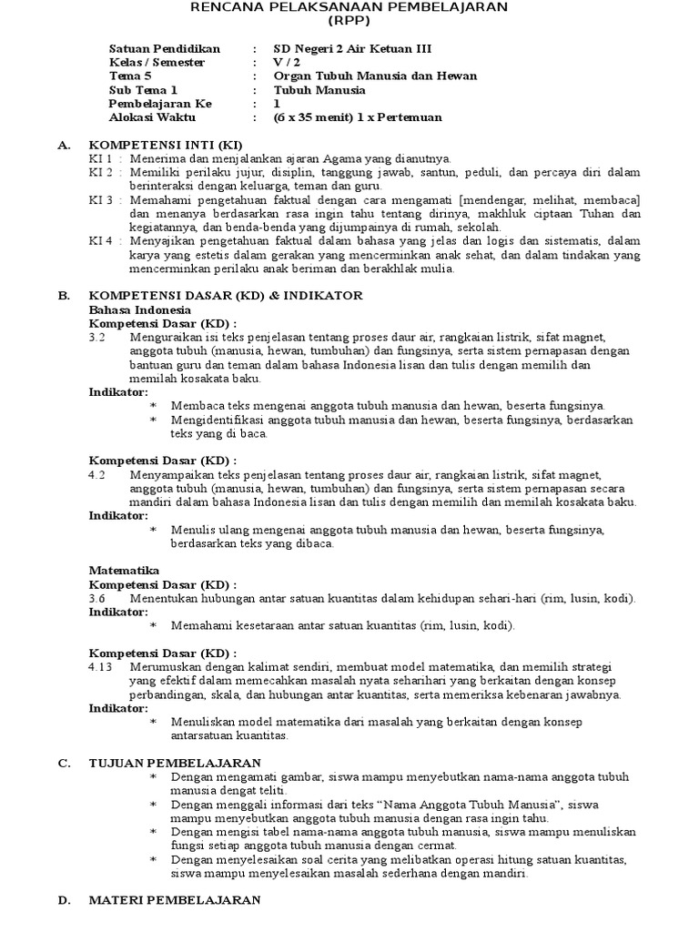 LINK DOWNLOAD soal IPA SDMI kelas 5 semester 1 dan kunci jawaban kami sediakan pada akhir artikel. Ringkasan RPP KURIKULUM 2013 SD KELAS 5 SEMESTER 2 - Organ Tubuh Manusia dan Hewan Hasil Revisi Terbaru 2015 RPP KURIKULUM 2013 SD KELAS 5 lengkap ini merupakan Rencana Pelaksanaan Pembelajaran yang harus dimiliki oleh Guru Kelas V Sekolah Dasar guna kelancaran proses belajar mengajar terutama pada Tahun Pelajaran Baru sekarang ini. Mengidentifikasi fungsi organ tubuh.