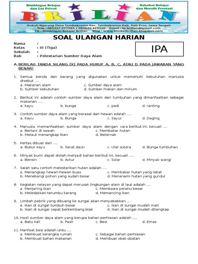Baik itu soal pengetahuan dan pemahaman mapuan soal. Soal IPA Kelas 4 SD BAB Pemanfaatan Sumber Daya Alam Dan Kunci Jawaban 5 Februari 2017 Bimbingan Belajar Brilian 0 Komentar A. SD Kelas 4 Tema 9-3 Pelestarian Kekayaan Sumber Daya Alam Indonesia. BERILAH TANDA SILANG X PADA HURUF A B C ATAU D PADA JAWABAN YANG BENAR.