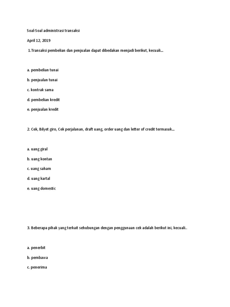 Kumpulan Soal Administrasi Transaksi. Soal Administrasi Transaksi Kelas X Soal Penataan Produk dan Jawaban September 1 March 1 February 9. Oleh Admin Diposting pada 31 Agustus 2017.