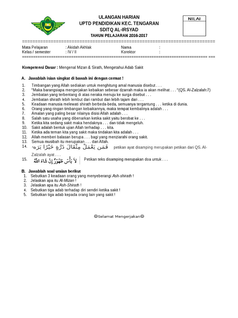 SOAL ULANGAN HARIAN AKIDAH AKHLAK KELAS 6 SEMESTER GENAB 1. Soal Dan Kunci Jawaban Akidah Akhlak Kelas 6 Semester 1 Guru Galeri Kumpulan Soal Ukk Aqidah Akhlak Sd Mi Semester 2 Genap Lengkap Soal Pts Uts Akidah Akhlak Kelas 4 Sd Mi Semester 1 Kurikulum 2013 Ruang. Soal uts akidah akhlak kelas 2 semester 1 beserta jawabannya ini soal uts untuk kelas 2 semester 1. Jumlah soal semuanya ada 55.