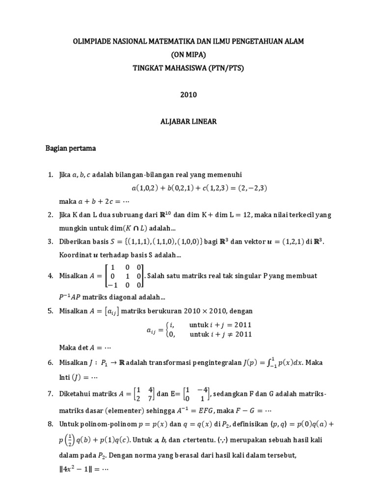 Kumpulan Soal Aljabar Linier Itb. Aljabar Linier dan Matriks i ALJABAR LINIER DAN MATRIKS Penyusun. Soal UAS Aljabar Linier Tujuan Ujian Akhir Semester UAS harus dilakukan dengan tujuan mengukur pencapaian indikator-indikator hasil belajar yang.