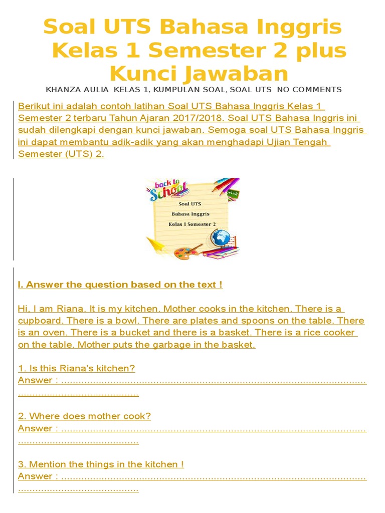Pada Soal Latihan UASPAS Bahasa Inggris SDMI Kelas 5 Semester 2 ini terdiri dari beberapa kompetensi dasar dari muatan materi mata pelajaran Bahasa Inggris. To the dining room. Does Putris house has a garden.