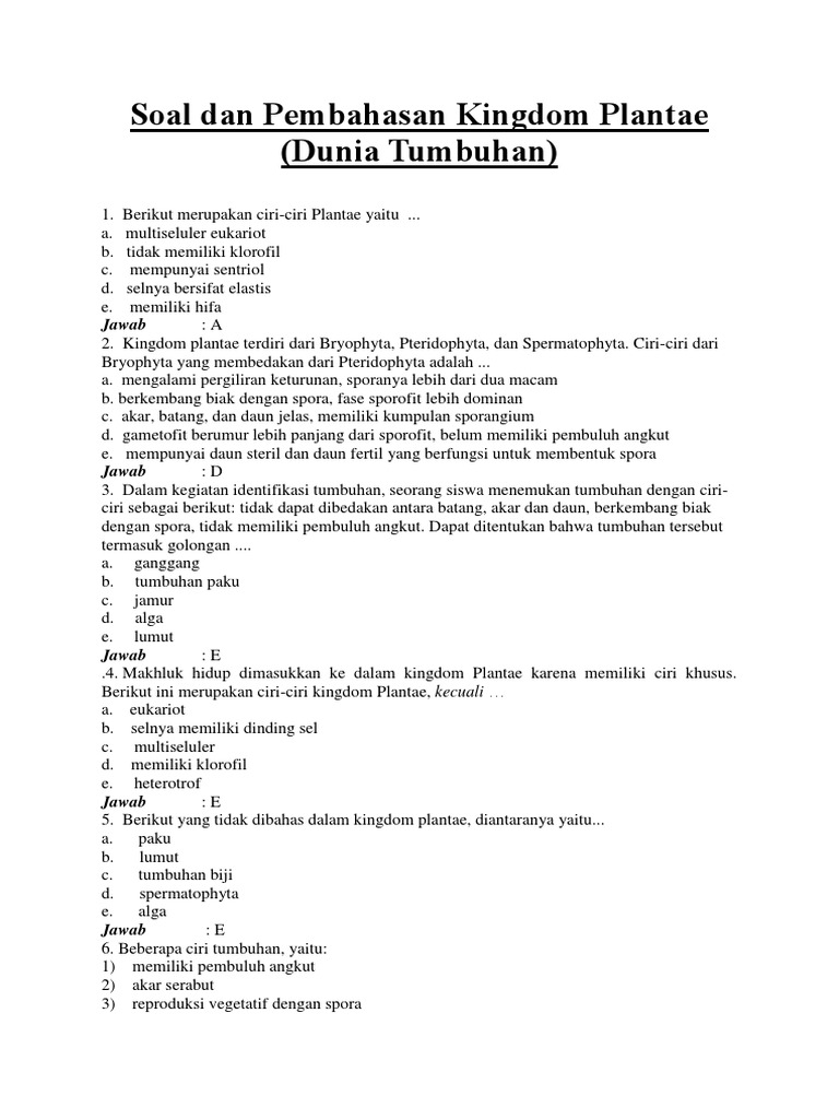 20 Soal Pilihan ganda. By Admin November 15 2018 Post a Comment. 25 Contoh Soal Kingdom Plantae dan Jawaban Pembahasan Oleh Anas Ilham Diposting pada November 25 2019 November 5 2020 Contoh Soal Kingdom Plantae Berserta Kunci Jawabannya SMA Kelas 10 Kingdom Plantae atau tumbuhan merupakan salah satu organisme eukariotik multiseluler yang mempunyai dinding sel dan klorofil.