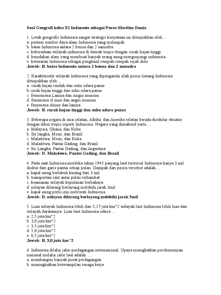 Contoh soal dan jawaban potensi geografis indonesiaSoal tentang kondisi fisik wilayah indonesia jika kita membahas mengenai kondisi fisik wilayah indonesia maka tidak akan lepas dari dua hal yaitu permasalahan. Ips Smp Kls 8 Soal Pg Smt Ganjil Terdapat 3 lautan besar yang mengelilingi indonesia dan menjadi batas dari zona laut. Sebutkan tiga landasan koperasi. Jawaban ekonomi kelautan kemaritiman dijadikan tumpuan bagi.
