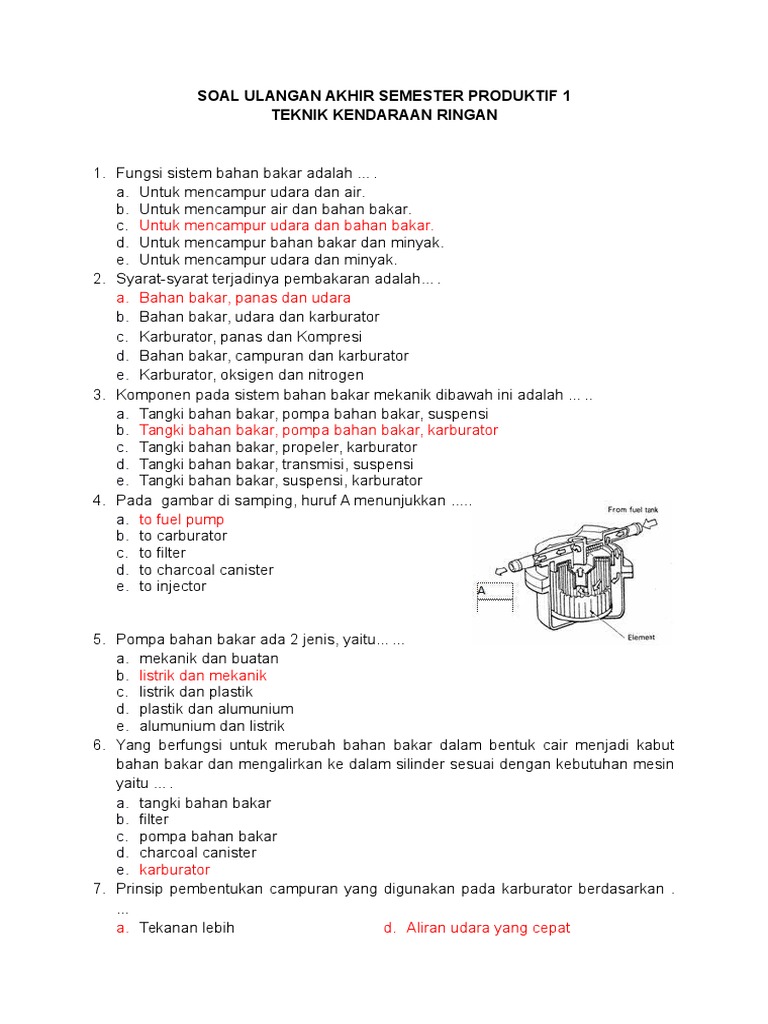 Berikut adalah soal ujian akhir semester untuk smk matapelajaran otomotif kendaraan ringann untuk smk kelas xi semester 1. Soal Sistem Bahan Bakar Bensin Beserta Jawaban Kelasnesia - Kembali lagi dengan Kelasnesia Pada artikel kali ini Kelasnesia memberikan sebuah artikel berjudul Soal Sistem Bahan Bakar Bensin Beserta Jawaban saya telah mempersiapkan tulisan ini dengan sebaik mungkin hanya untuk anda pengunjung setia Kelasnesia. Semangat pagi untuk pengunjung semua dimanapun Anda berada.
