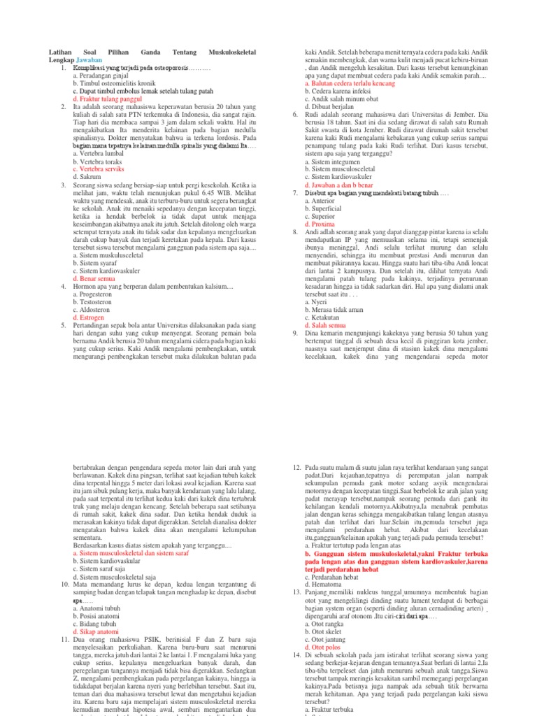 Kumpulan Soal Kasus Patah Tulang. Seorang laki-laki usia 60 tahun datang ke posyandu lansia klien mengeluh kakinya bengak sejak semiggu yang lalu. Patah tulang dapat menimpa berbagai kelompok usia tetapi individu dengan tulang rapuh atau kepadatan tulang yang rendah lebih berisiko mengalaminya.