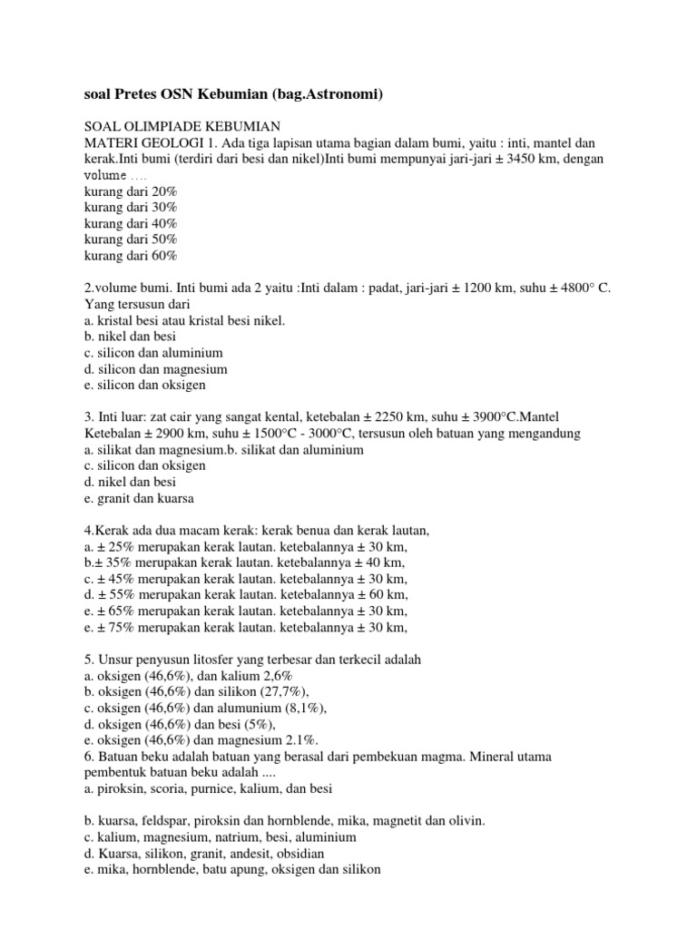 Kumpulan Soal Kebumian. Kali ini saya akan berbagi kepada earth lovers beberapa soal olimpiade kebumian mulai dari seleksi tingkat kabupaten sampai tingkat nasional dan beberapa soal internasional. SOAL OSN KEBUMIAIN TINGKAT KABUPATEN.