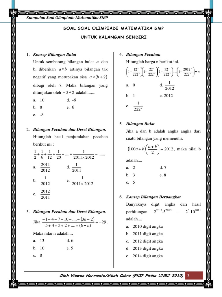 Kumpulan Soal Latihan Soal Olimpiade Matematika Smp. Latihan Soal Olimpiade MATEMATIKA SMP Tipe 1 2 3 Dengan Kunci Jawaban Kamis 26 April 2018 Selamat datang bank soal lengkap dengan pembahasannya untuk tingkat SMP dalam file pdf dapat di download pada list dibawah ini. Kerjakanlah soal-soal berikut sebagai latihan dalam mengerjakan soal-soal olimpiade matematika.