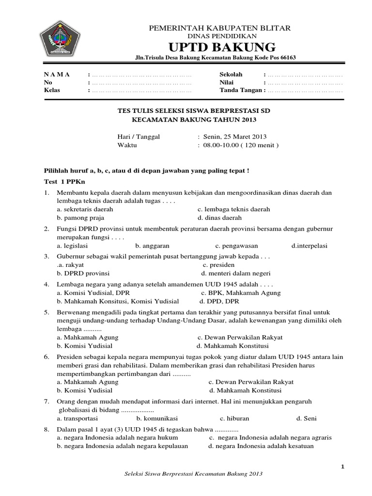 Kumpulan Soal-soal Siswa Berprestasi Sd. 3 telp faksimile 0280 6260292. Soal Lomba Siswa Berprestasi SD 20192020 Dalam soal yang akan kami bagikan nanti terdiri dari Bahasa Indonesia terdiri dari 25 soal pilihan ganda dan 5 uraian.