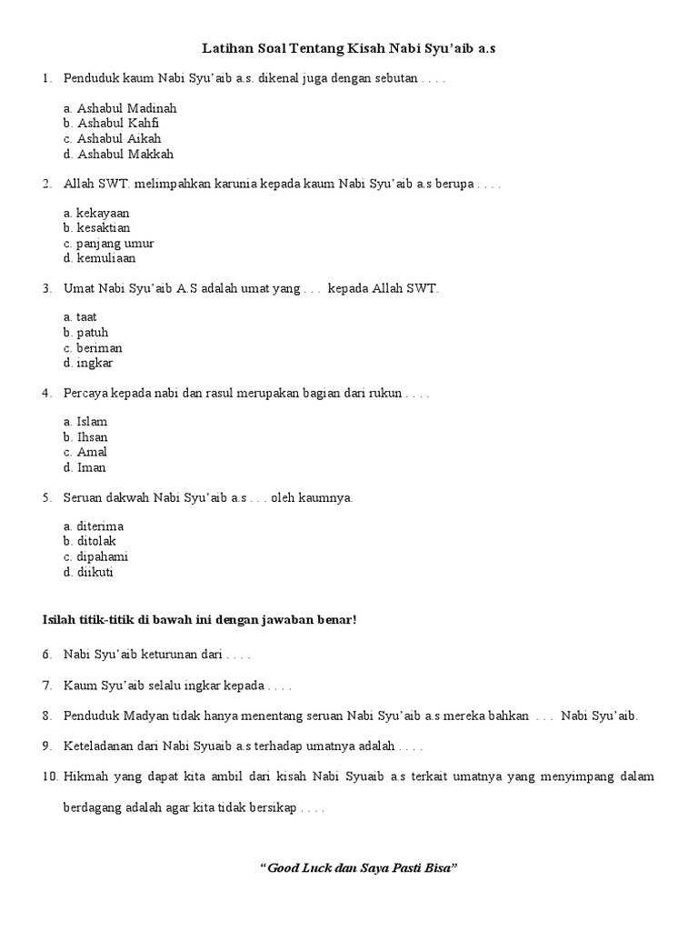 Kumpulan Soal Tentang Keteladanan Nabi Syu'aib. Allah memberikan cobaan kepada Nabi Ayyub bertujuan untuk. Dalam daftar 25 nabi biasanya dia disebutkan setelah Luth dan sebelum Musa.