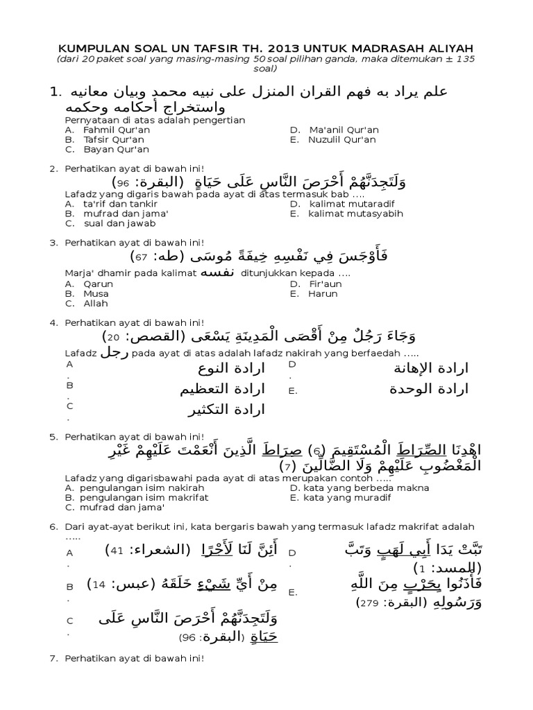 Berikut ini adalah kumpulan dari berbagi sumber tentang latihan un tafsir yang bisa gunakan untuk file revisi dan diunduh secara gratis dengan menekan tombol download biru dibawah ini. Pilihlah dan lingkari jawaban yang paling benar. Download Soal UN TAFSIR KEAGAMAAN 20152016. Ujian Nasional biasa disingkat UN UNAS adalah sistem evaluasi standar pendidikan dasar dan menengah secara nasional dan persamaan mutu tingkat pendidikan antar daerah yang dilakukan oleh Pusat Penilaian Pendidikan Depdiknas di.