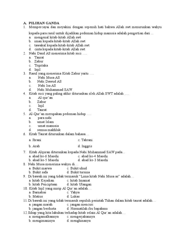 Latihan Soal Pai Kelas 8 Iman Kepada Kitab Allah. Contoh soal pendidikan agama islam pai kelas 12 semester 1 dan semester 2 kurikulum 2013 untuk kisi kisi latihan soal uas mid semester berupa soal pilihan ganda. Menampilkan sikap mencintai Al-Quran sebagai kitab Allah.
