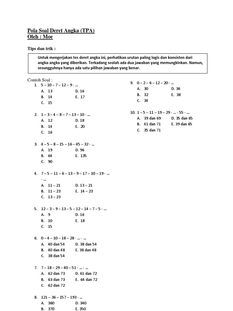 Contoh soal psikotes deret angka yang akan kami berikan akan kami lengkapi dengan tips serta trik dalam mencari pola dan menjawabnya. TO Soal CPNS Contoh Soal CPNS Tes Numerik Deret Hitung. Soal soal psikotes pdf. Selesaikan deret dibawah ini dengan memilih jawaban yang tepat.