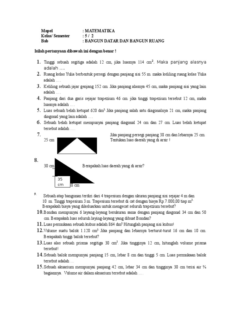 Soal Ipa Kelas 5 Sd Bangu Datar. Tentukanlah luas permukaan dari balok tersebut. LatexpageBangun Datar Bangun datar adalah sebuah obyek benda dua dimensi yang dibatasi oleh garis-garis lurus atau garis lengkung.