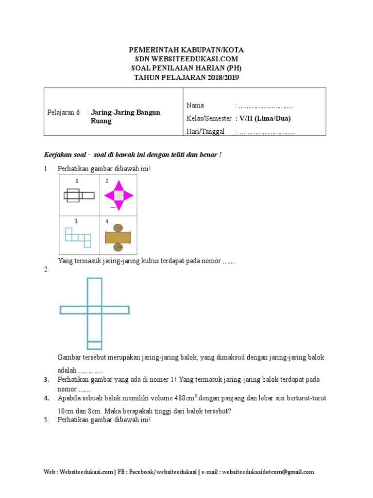 Jumlah soal pilihan ganda 25 soal isian singkat 10 soal uraian 5 soal uas. Susun menjadi sebuah kubus sehingga akan diperoleh tutup kubus adalah nomor 5. Dalam pembahasan tersebut dipaparkan tentang rumus volume dan luas Dalam pembahasan tersebut dipaparkan tentang rumus volume dan luas permukaannya juga tentang jaring jaring diagonal ruang dan diagonal sisinya. Admin dari blog Contoh Soal Terbaru 2019 juga mengumpulkan gambar-gambar lainnya terkait contoh soal jaring jaring kubus dan balok dibawah ini.