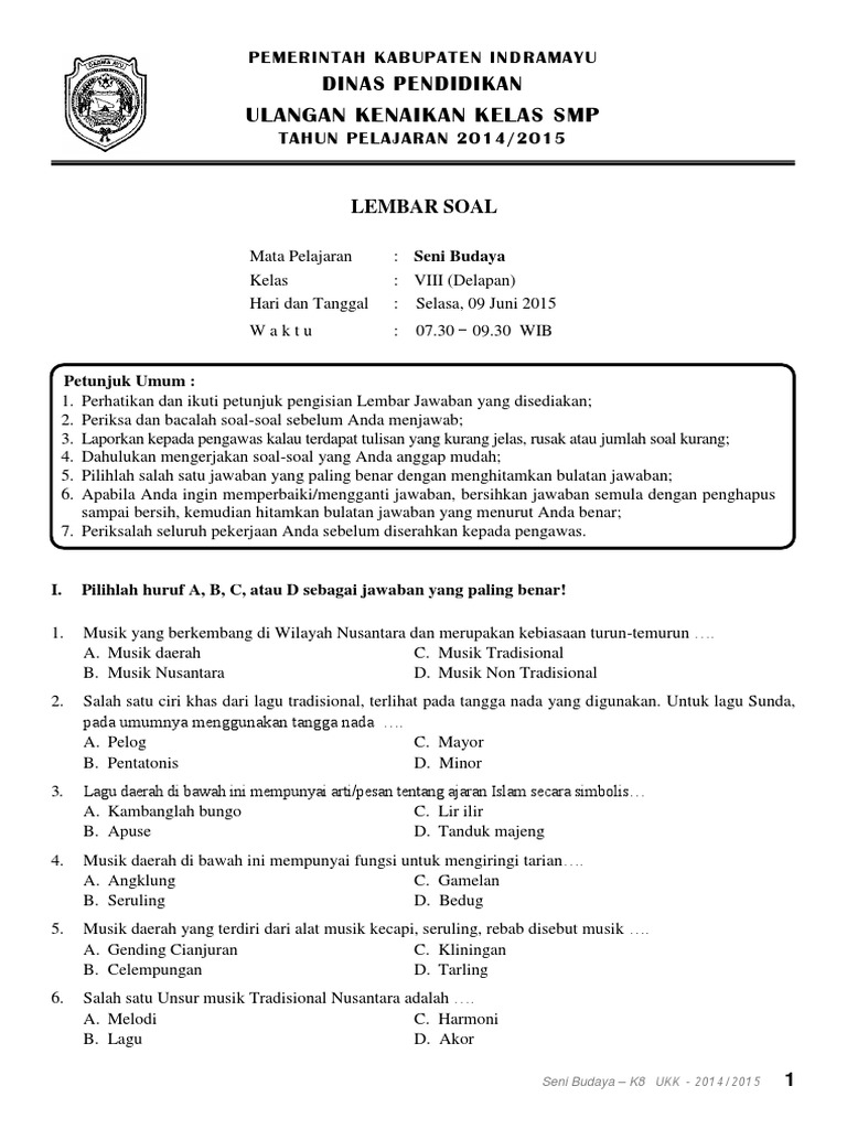 Soal Ukk Kelas 8 Mapel Sbk. Soal UKK UAS SBK Kelas 8 SMP MTs Semester 2 Genap Note. Soal Dan Jawabannya Pts Smp Kelas 7.