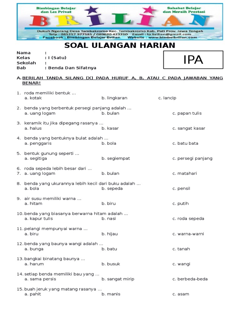 Soal nomor 1 sebuah mobil dengan kecepatan 72 km jam. 2018 Soal latihan ulangan harian ulhar uh tematik kelas 1 SD MI tema 7 ihwal Benda Hewan dan Tanaman Di sekitarnya subtema 4 tentang Bentuk Warna Ukuran dan Permukaan Benda terdiri dari 20 butir soal dan disertai dengan kunci jawabannya serta sesuai dengan kurikulum 2013 edisi revisi. Penilaian harian untuk mata pelajaran IPA Tema 7 Peristiwa dalam Kehidupan kelas 5 SDMI dengan materi.