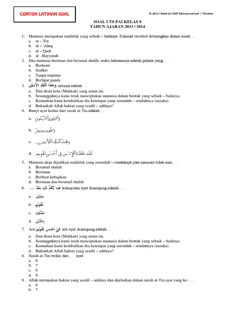 Pilihlah jawaban yang paling tepat dengan memberi tanda silang X. Soal UTSPTS PAI Kelas 8 Semester 2 Kurikulum 2013 Tahun 2020 - Kegiatan penilaian tengah semester atau ulangan tengah semester di laksanakan setelah pertengah semester Soal UTS mata pelajaran PAI ini dapat bapakibu guru gunakan juga sebagai contoh referensi untuk pembuatan soal atau untuk soal latihan peserta didik di kelas sebelum menghadapi Ulangan Tengah Semester UTS Semester. Soal yang kami bagikan ini adalah soal Ulangan Tengah Semester Genap. Kumpulan Soal Penilaian Harian PTS UTS UAS PAS UKK PAT SD SMP MTs SMA SMK Soal CPNS Soal Psikotes Soal SMPTN dan lain-lain Pada kesempatan kali ini akan kami bagikan kumpulan Soal UTS Ulangan Tengah Semester 2 Genap Kelas 8 VIII SMP MTs Mapel Lengkap.